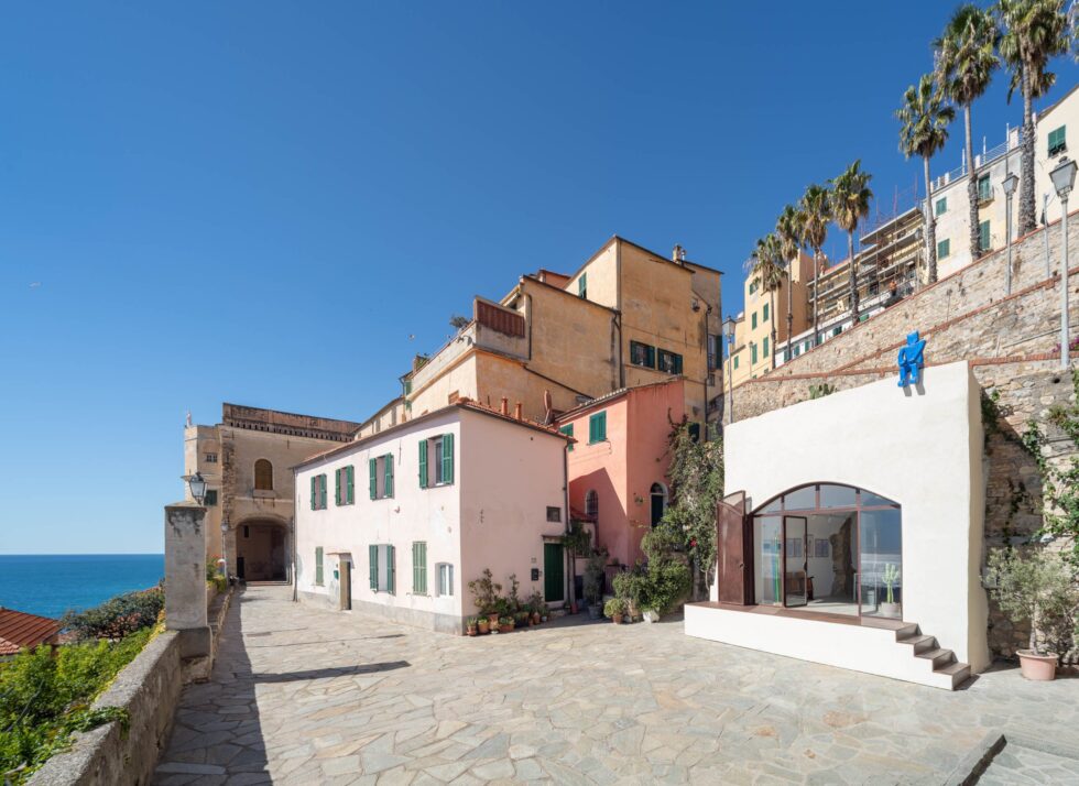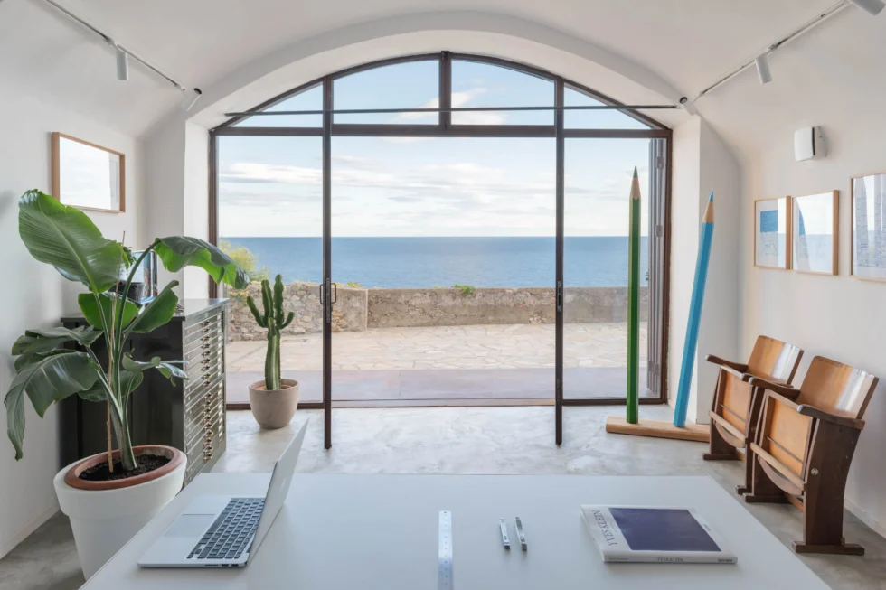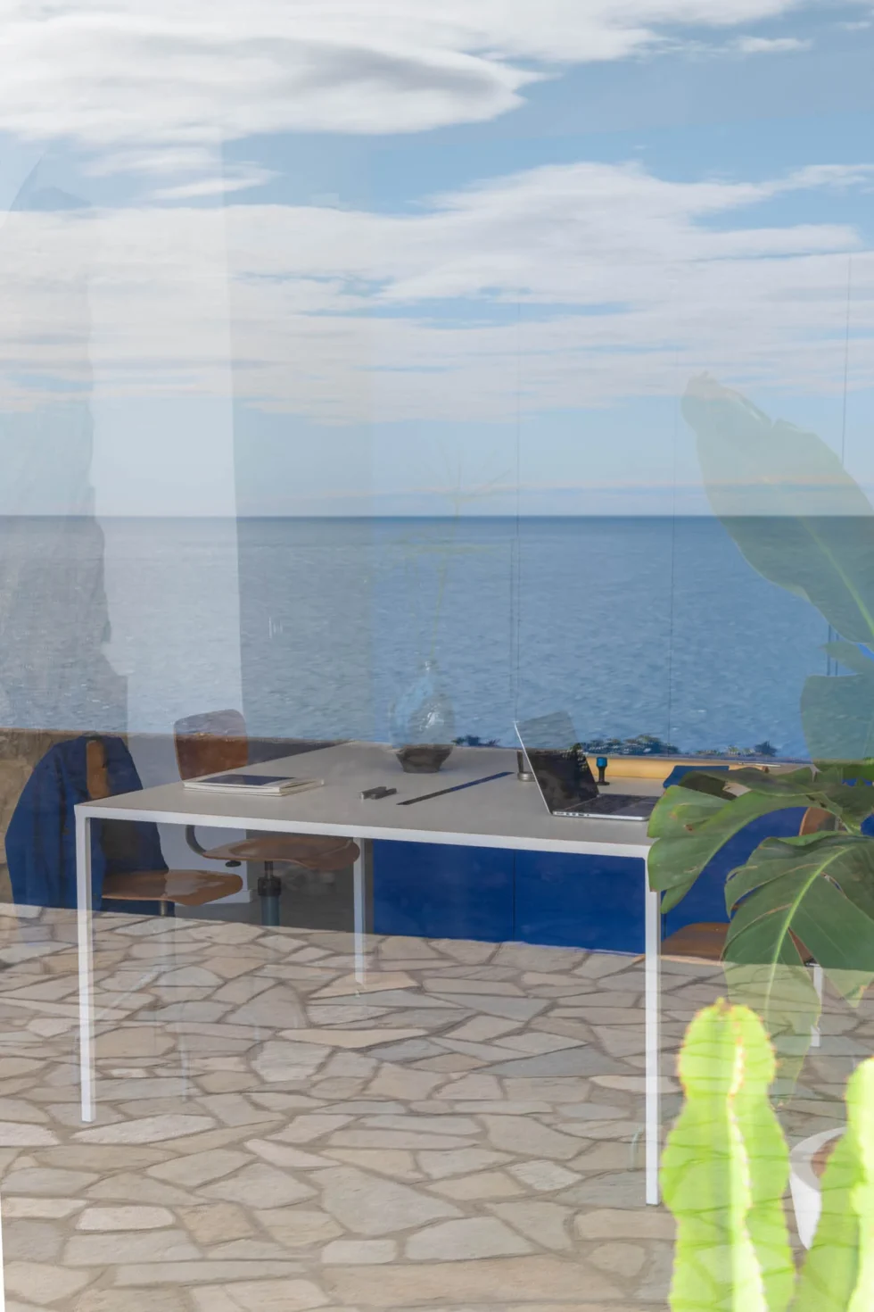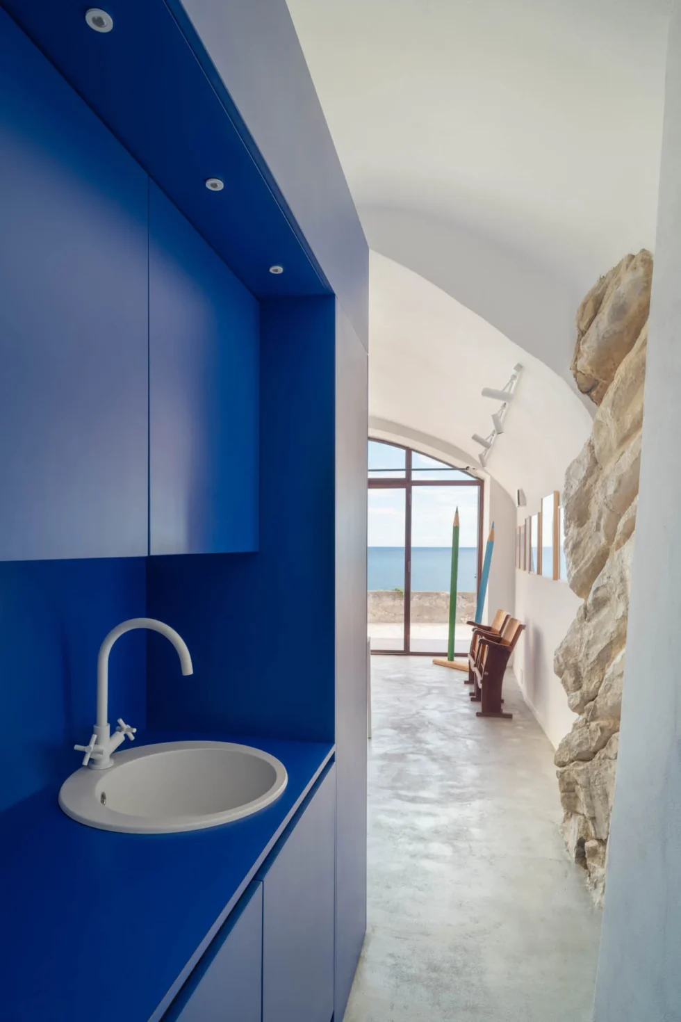 The internal space of 30sqm is conceived around the minimal and multifunctional Blue Cube, mirroring the tones of the sea and sky which become the only seeable elements from the inside.