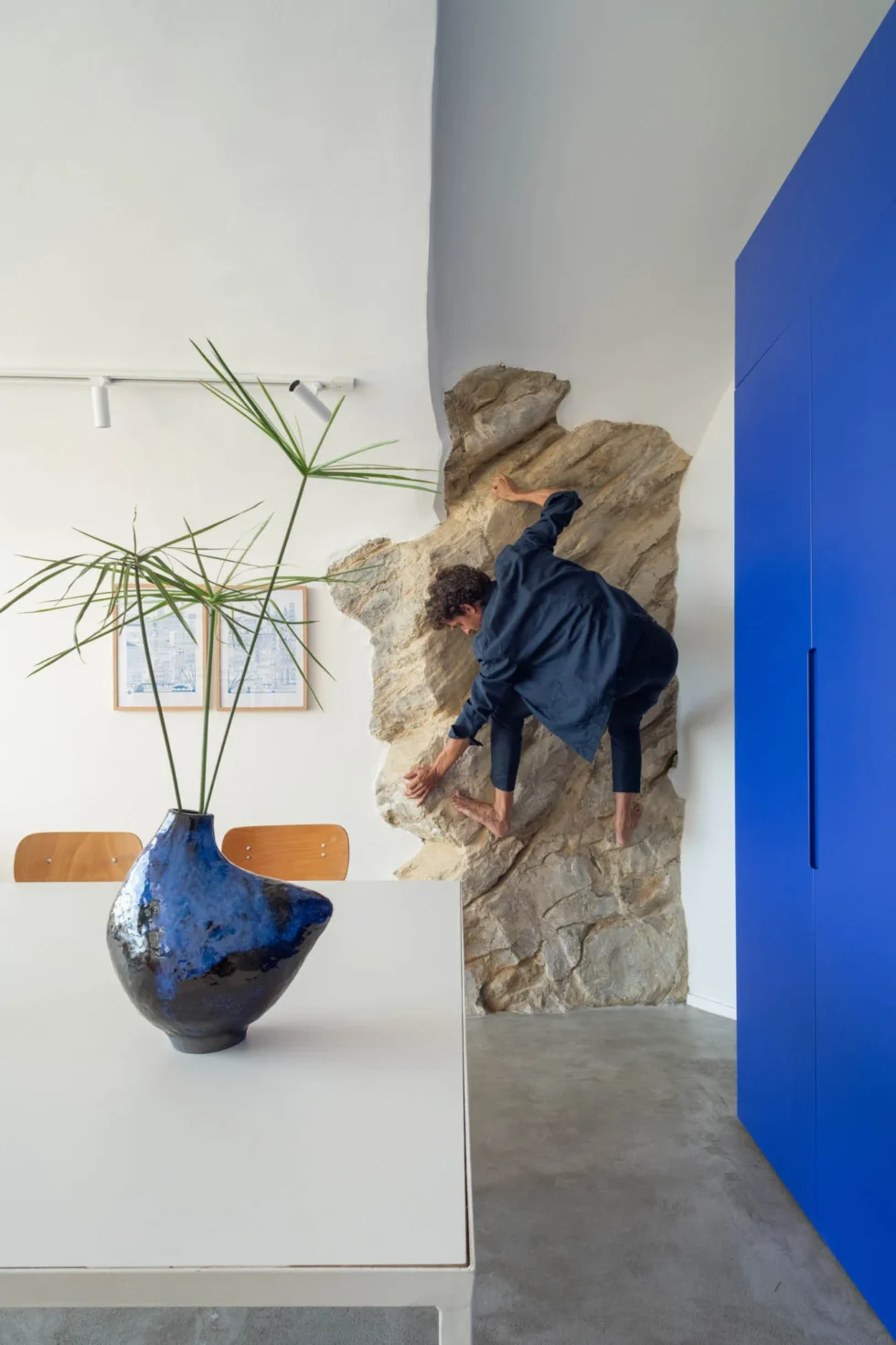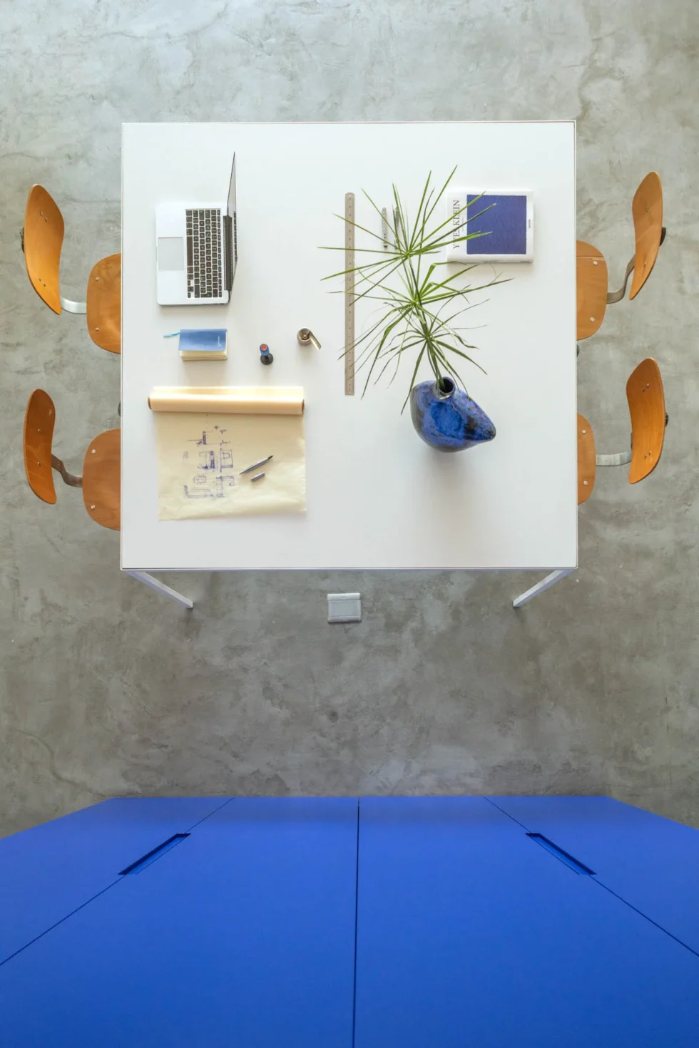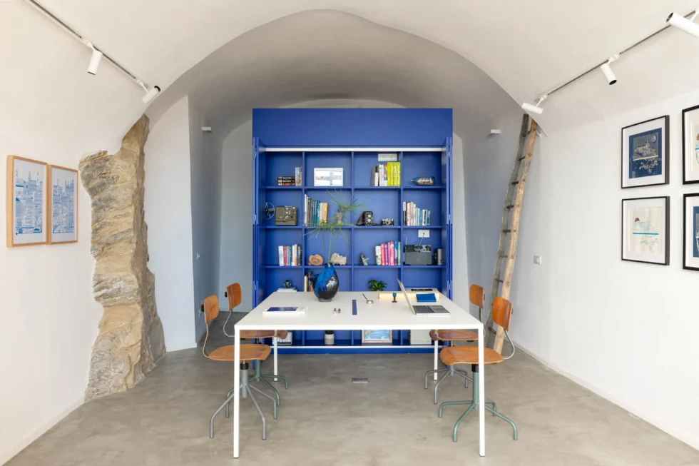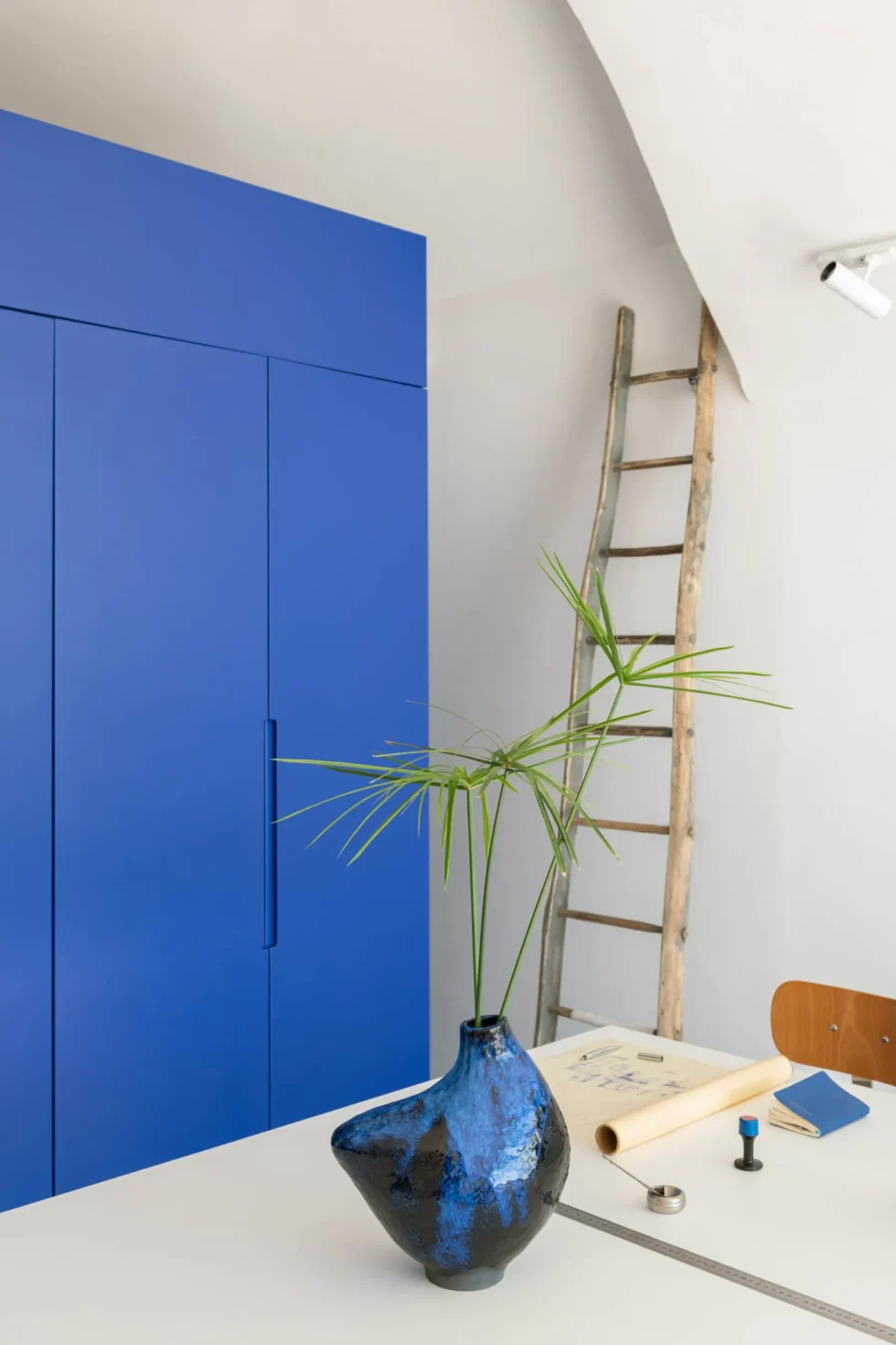 The Blue Cube, of about 5sqm, is the key foundation of the studio’s multiple functionalities: it separates the more private area of the back from the front one which serves as working space and gallery to showcase some of Davide’s works .