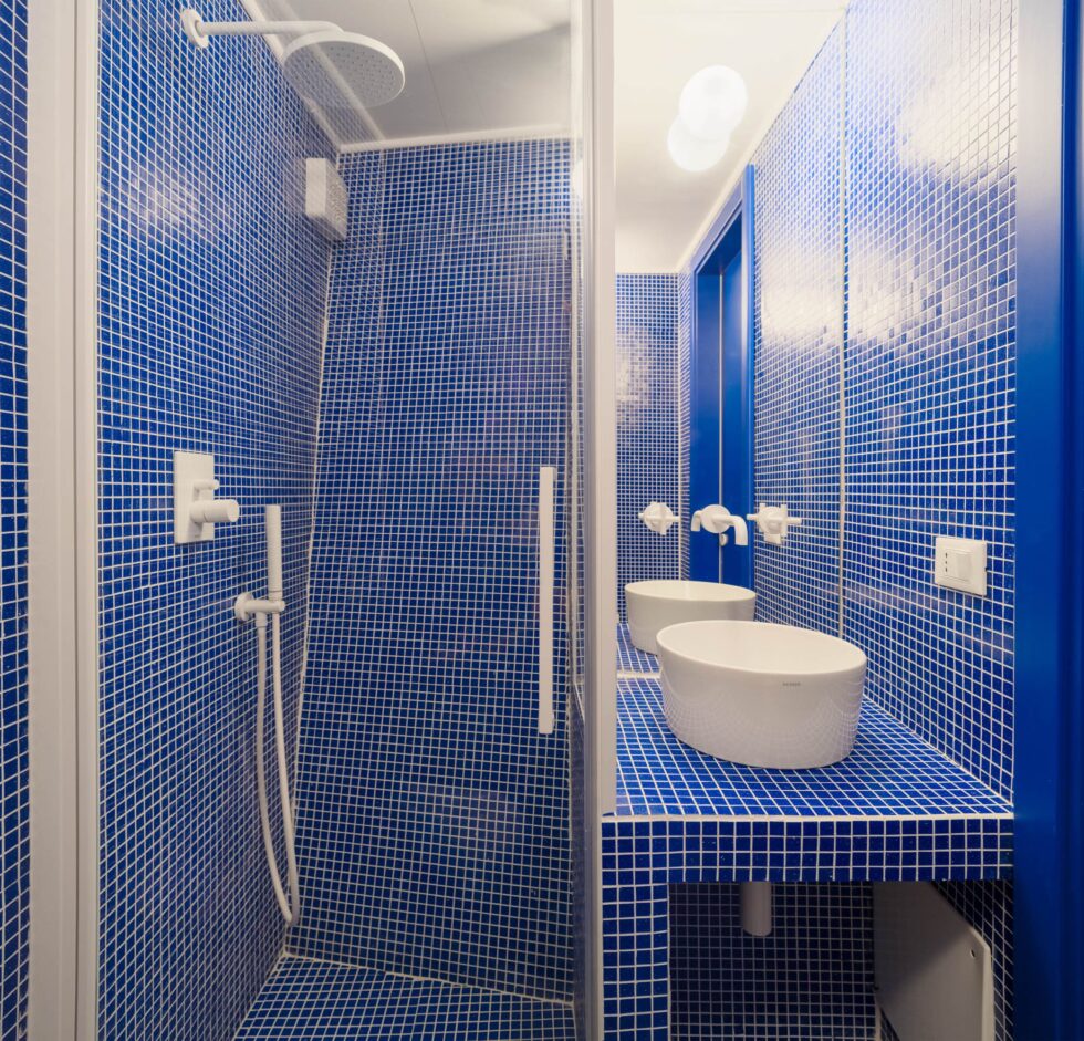 Looking at the right side of the cube is the entrance to the small bathroom, covered with blue mosaic tiles and furnished with white sanitary fittings and taps.