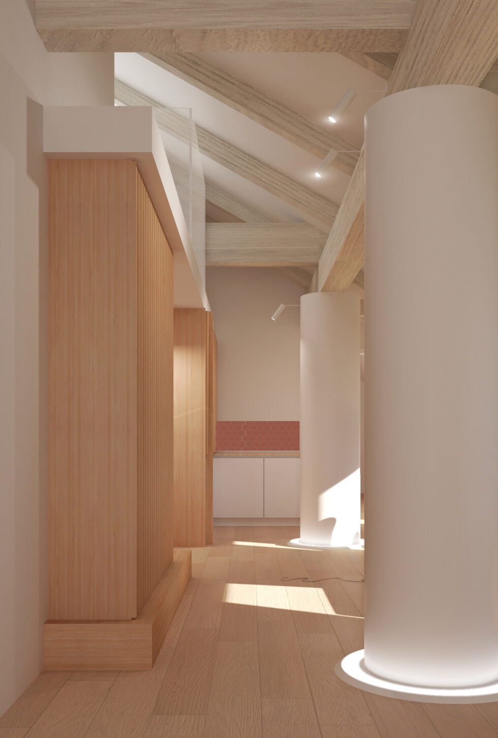 The beams of the sloping roof and the central pillars have been transformed into ornamental columns, illuminated from the base, which furnish the environment and add a touch of elegance. This solution has made the structural elements not only non-invasive but integral parts of the overall aesthetics.