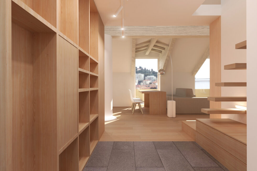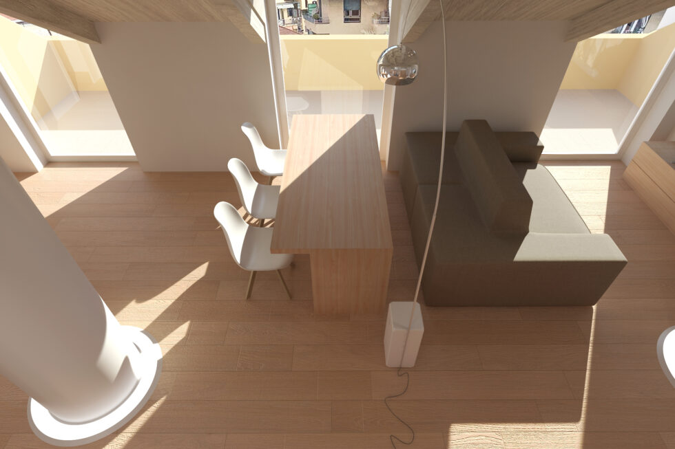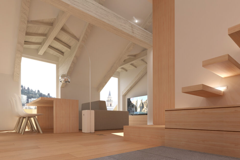 In the heart of Imperia, stands a unique attic characterized by an original structure of exposed beams and strategically positioned pillars. The renovation project has transformed this anonymous environment into a space of design and functionality.
