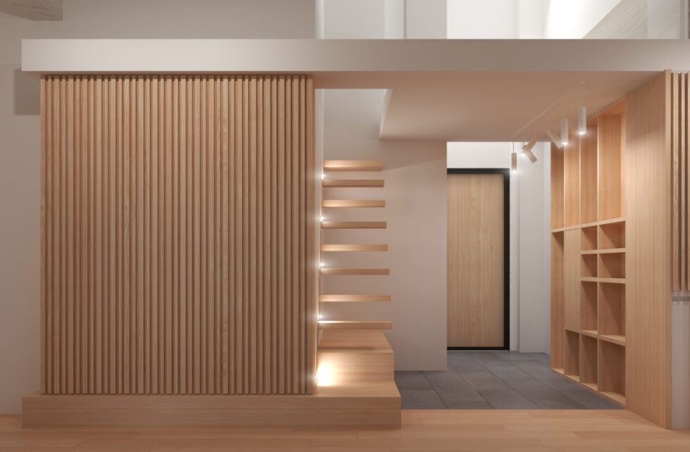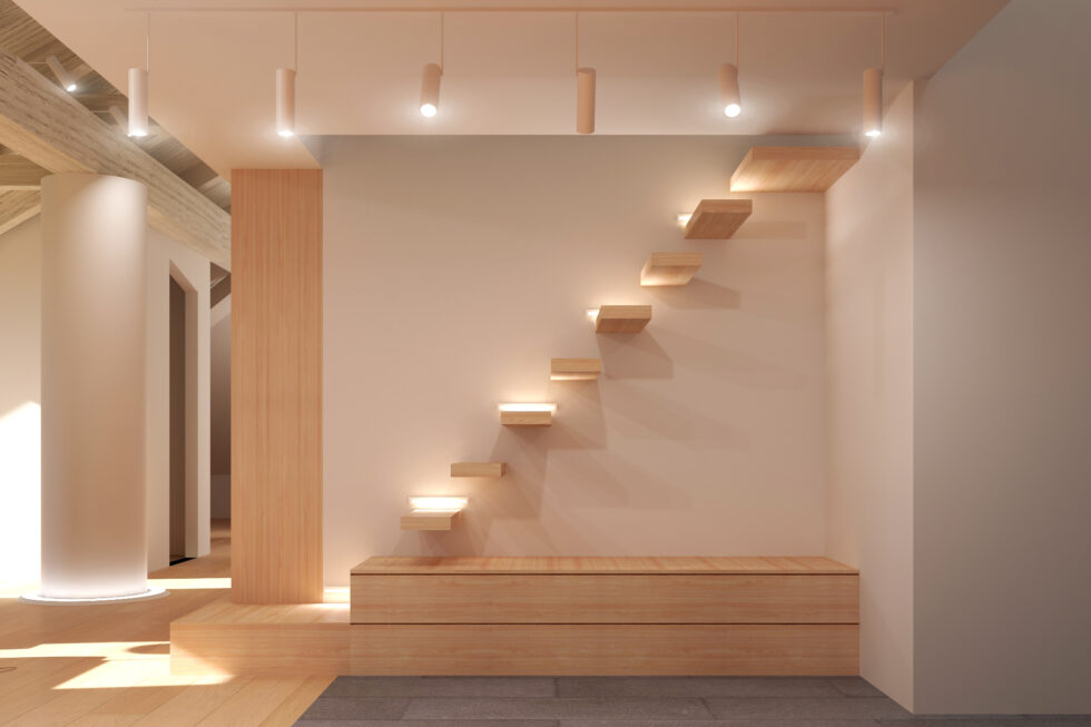 The entrance is dominated by a light cantilevered staircase leading to a loft, visible from various parts of the house, adding an element of dynamism and verticality to the space.
