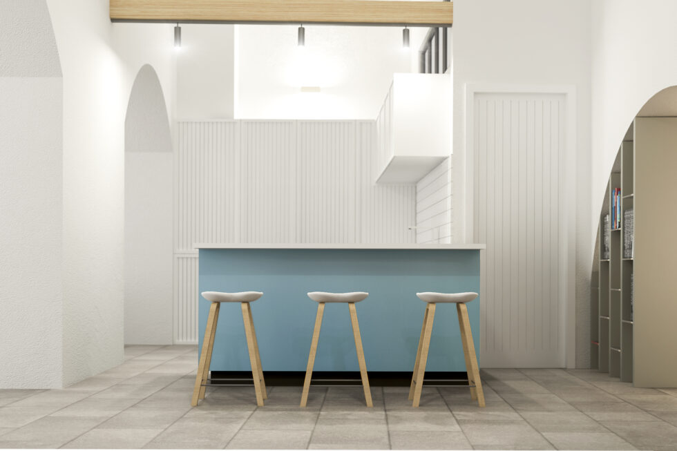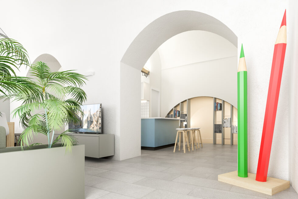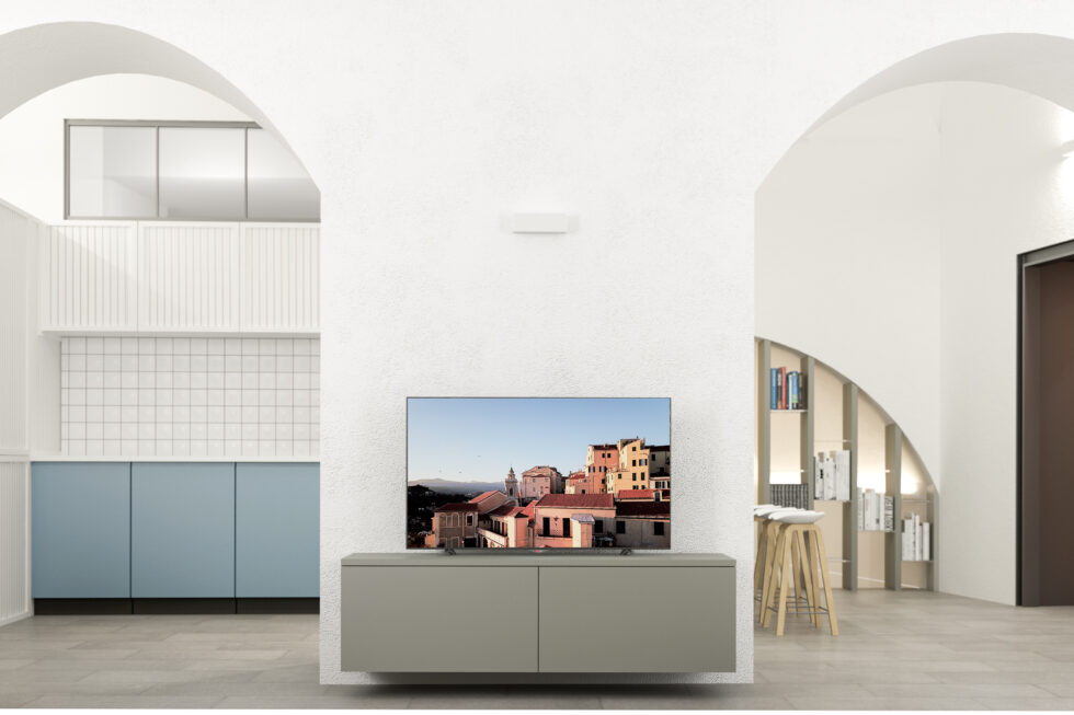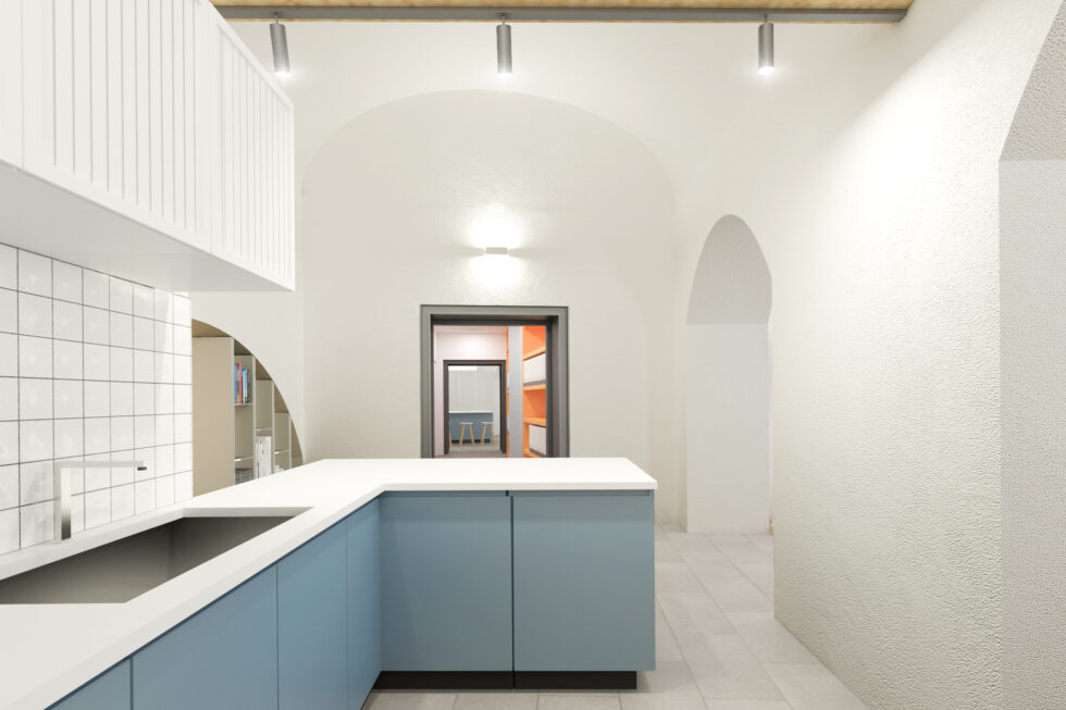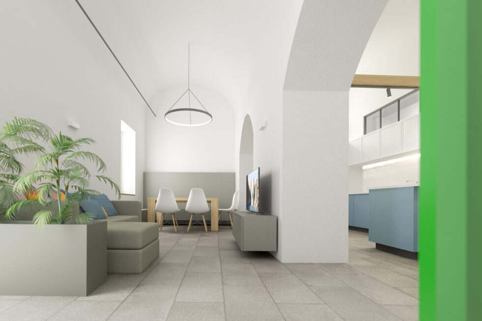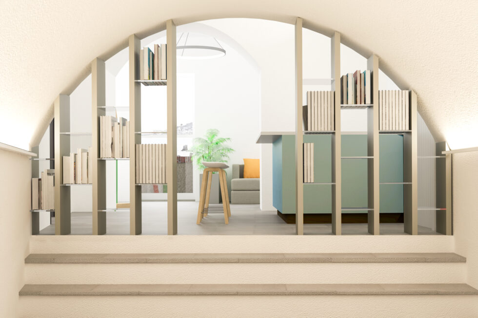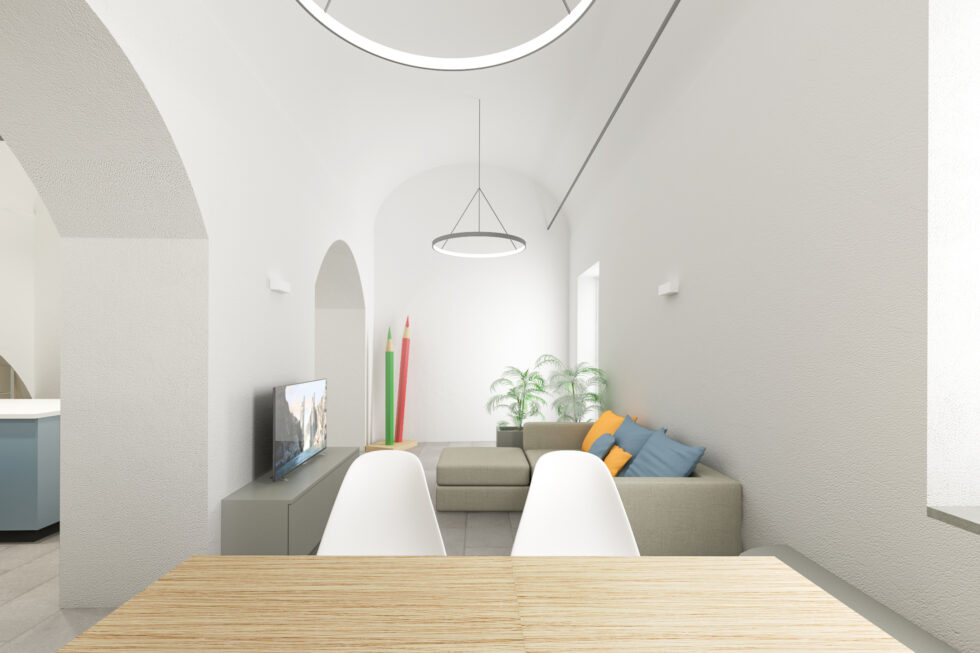 In the living area, the splendid historical vaults have been brought to light, lending the space an aura of nobility and spaciousness. The arches harmoniously interact with the adjoining spaces of the kitchen and a distinctive study, separated by a bookcase nestled under another arch, showcasing its beauty and distinguishing it with grace.