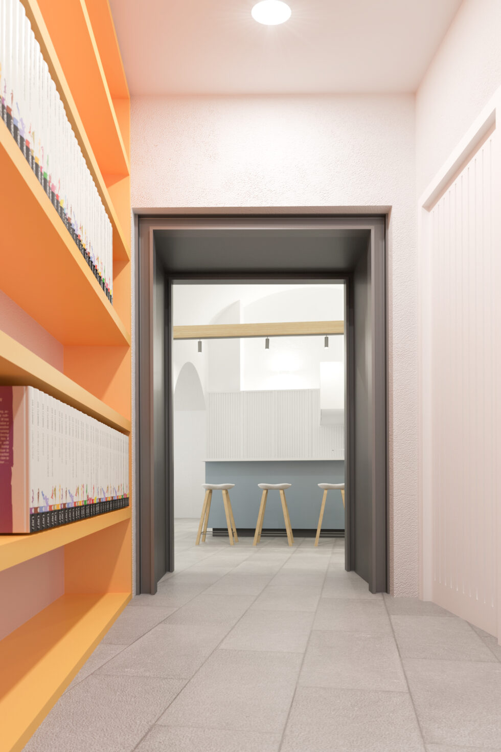The new passage between the two units has been carefully designed, using load-bearing beams to create an opening that leads to a distribution space dominated by a yellow bookcase, a distinctive element that adds a touch of liveliness and modernity to the historical context.