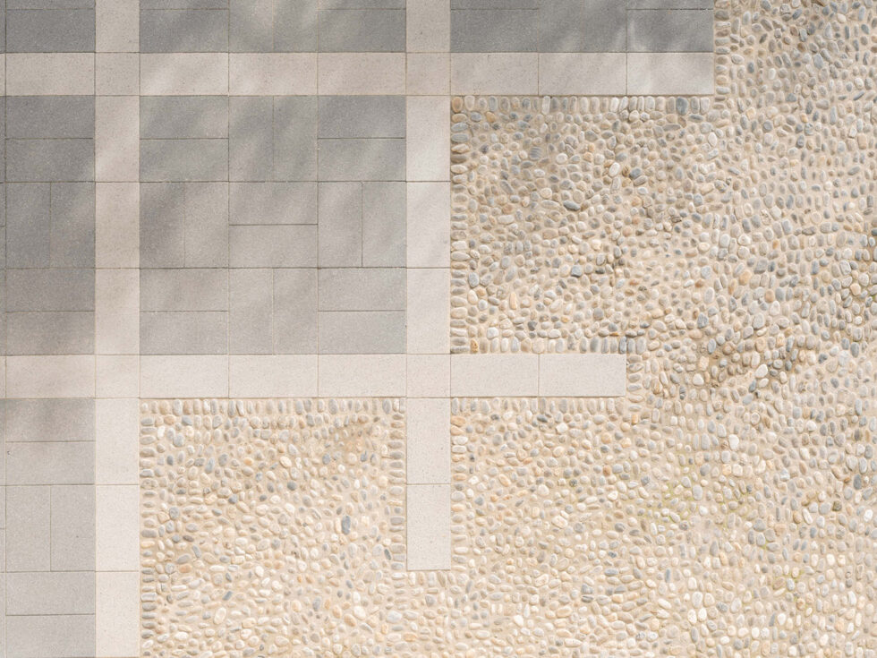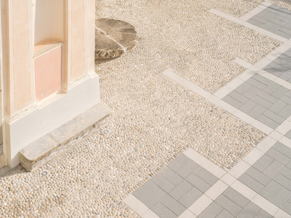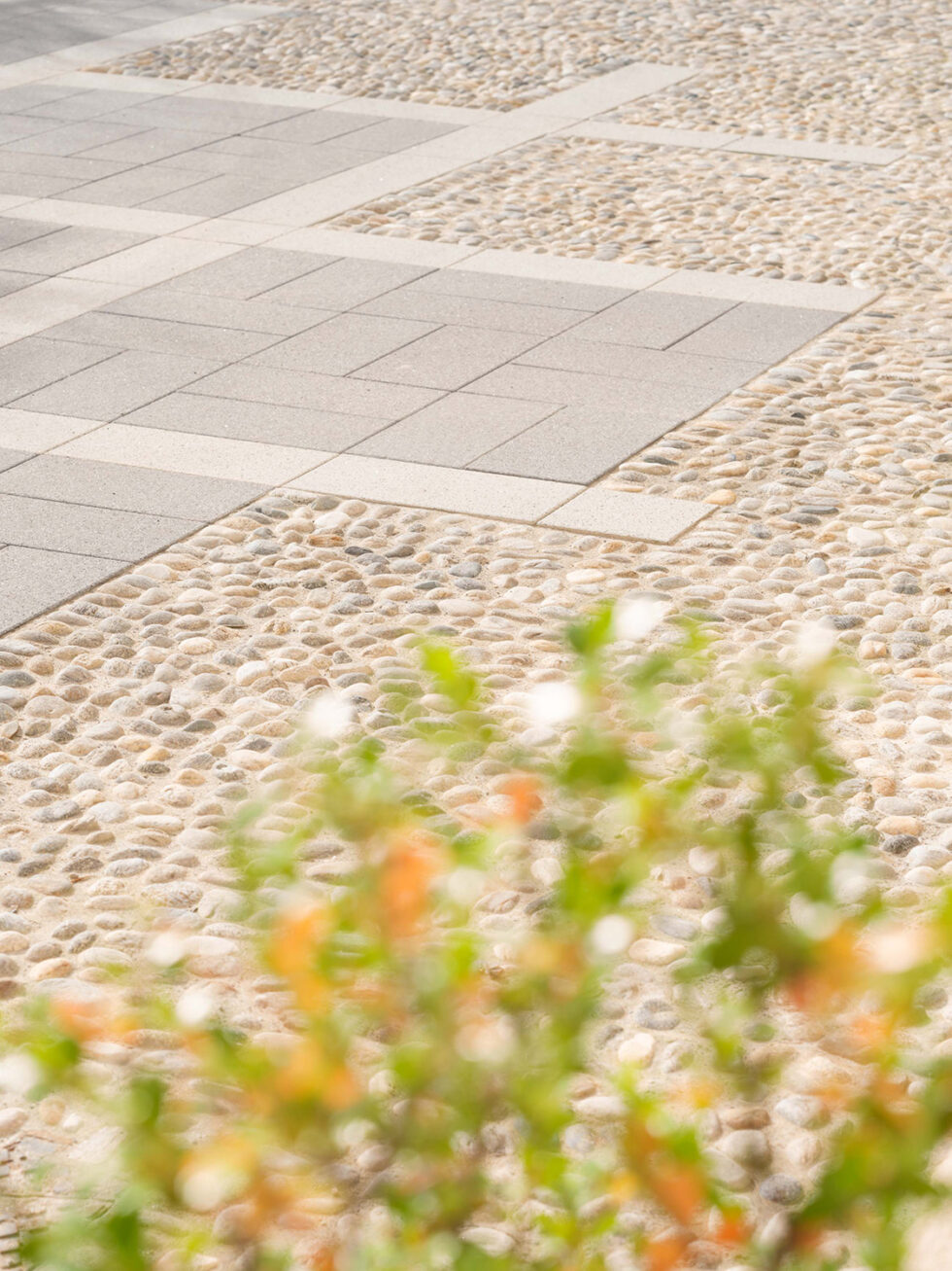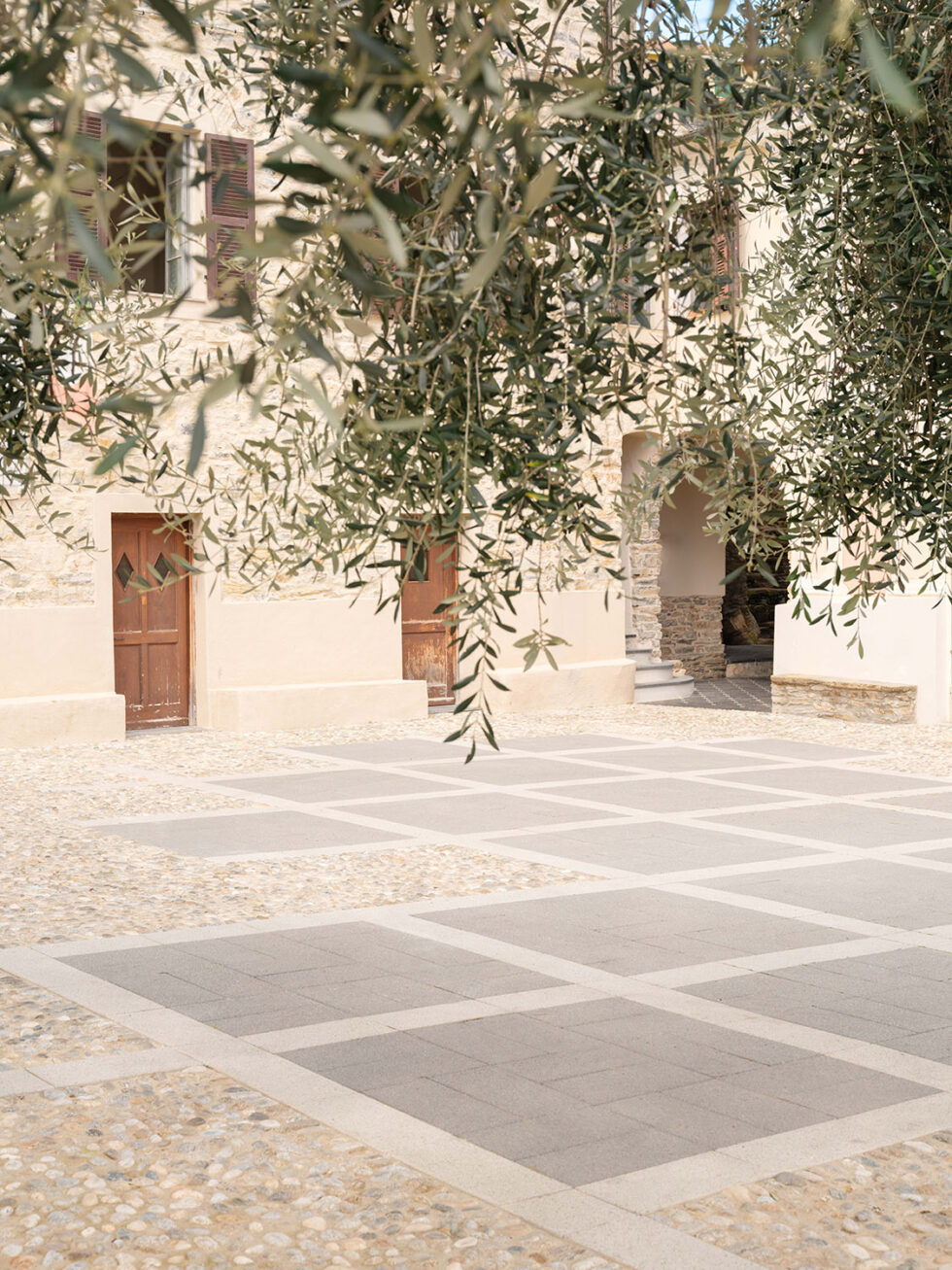 The paving, the visual and sensory centerpiece of the space, is made with high-quality local materials: natural stone, granite aggregates, and river pebbles that recall the shapes and colors of the surrounding landscape. The interplay of textures and tones creates subtle chiaroscuro effects that shift with the daylight, blending seamlessly into the historic and natural context.