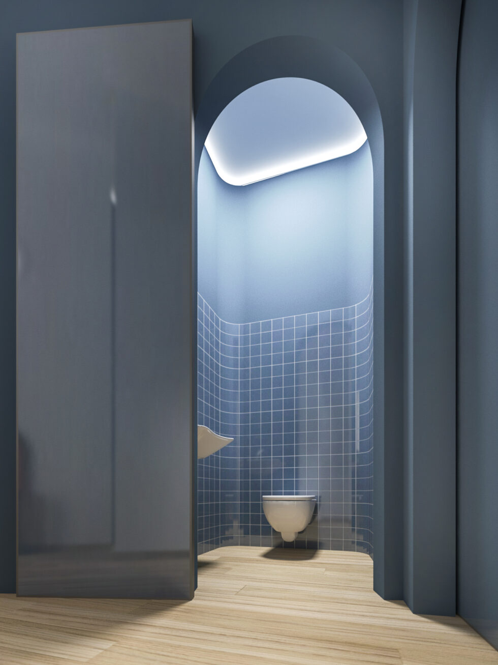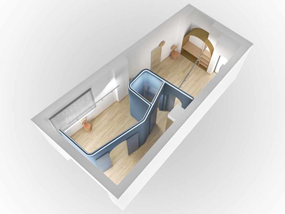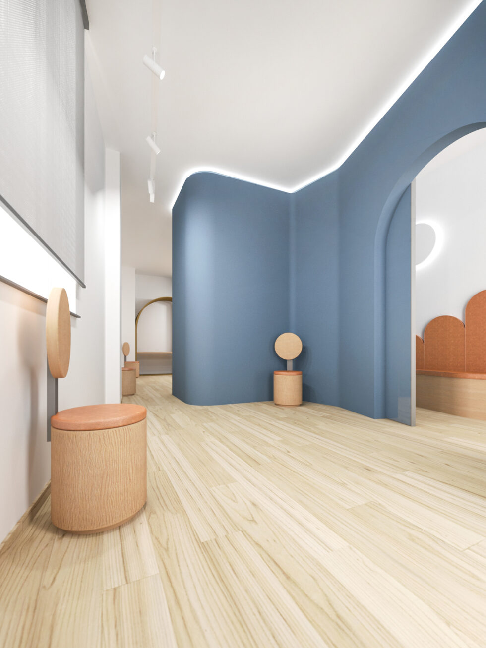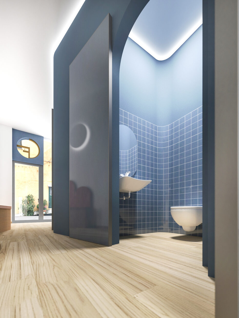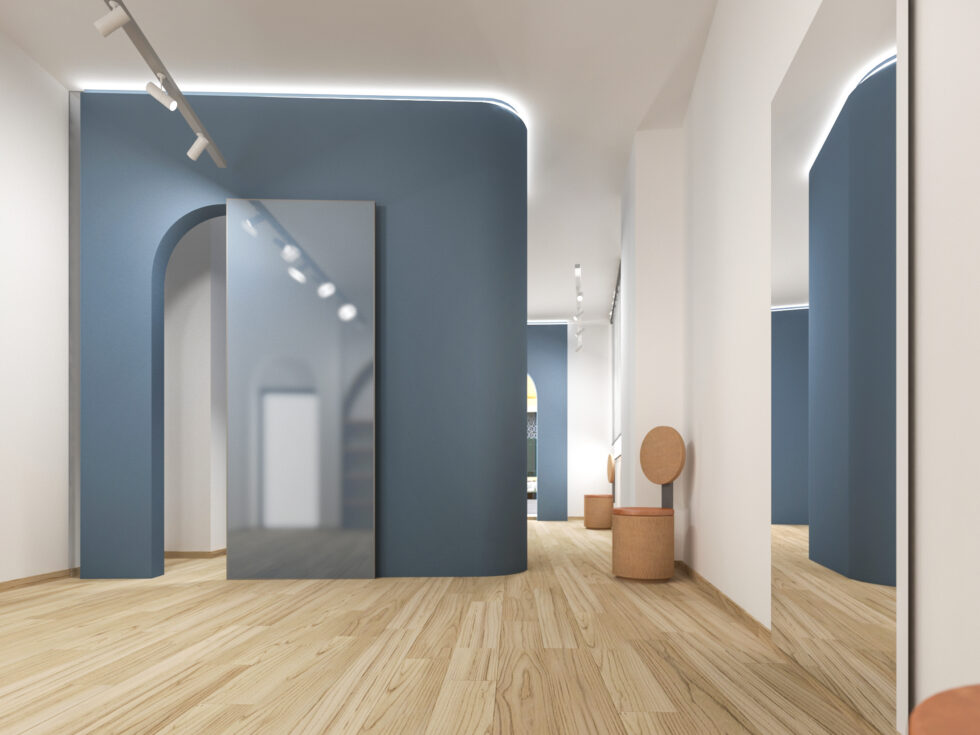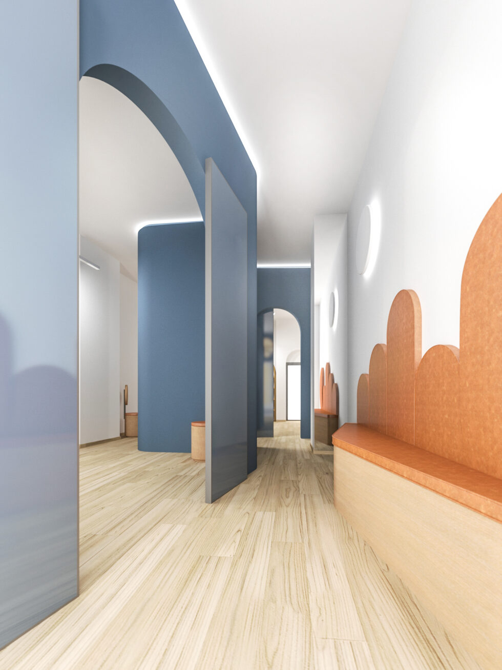 Outside, a distinctive element captures attention and anticipates the experience inside: an intelligent interconnection of spaces, carefully studied to optimize the use of available space. A central core, housing the restrooms, unfolds like a ribbon that wraps around and embraces the various professional areas. The walls colored in blue, carefully positioned within the environment, precisely delineate the spaces without ever touching the perimeter boundaries, creating a clear distinction between dividing and containing walls.
