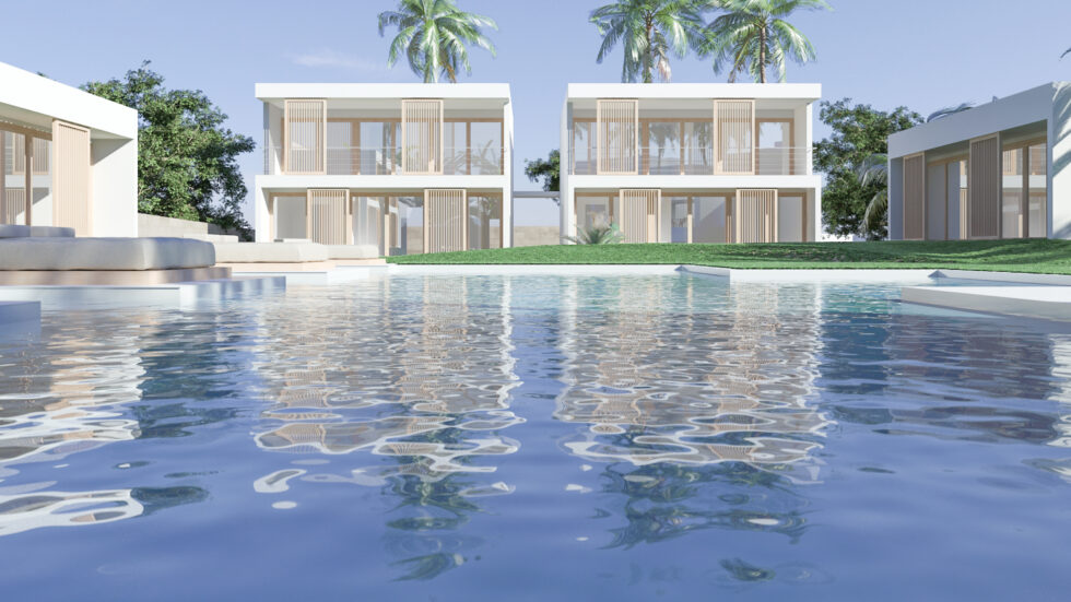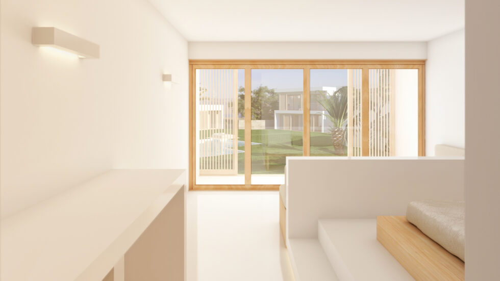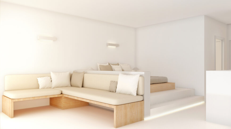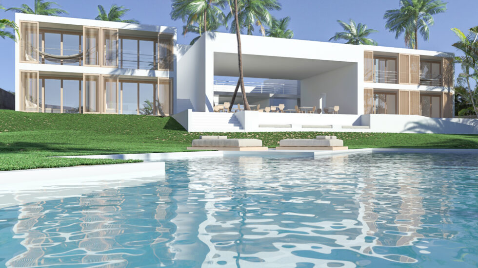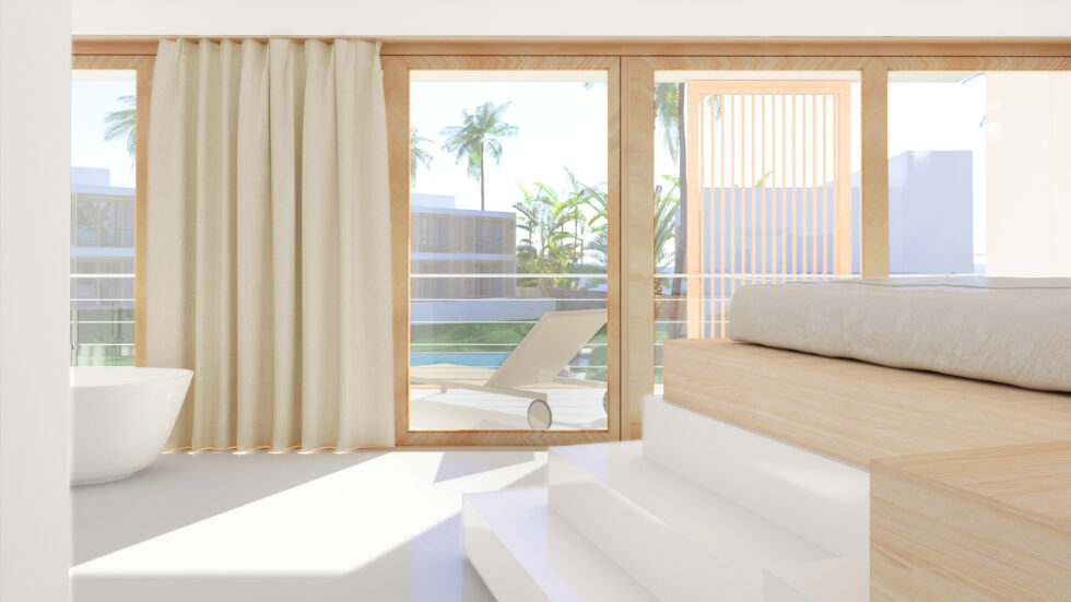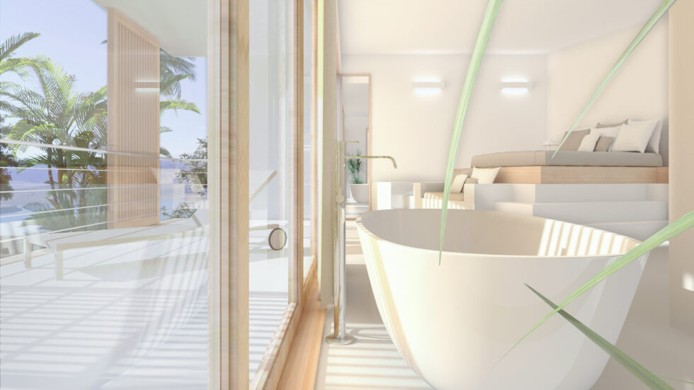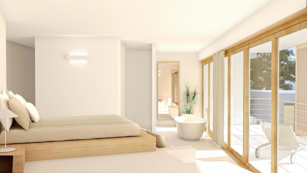 The central pool, the focal element of the complex, has been strategically positioned to offer spectacular views from all rooms and villas, accentuating the connection with the ocean and the surrounding landscape. The island lounges and event space integrated into the pool contribute to creating a welcoming and inviting environment for guests.