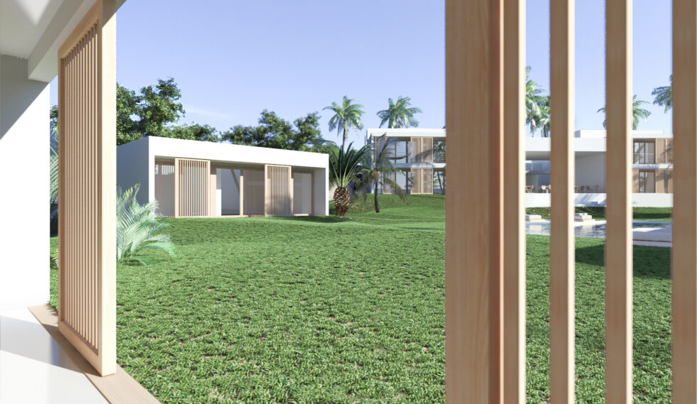 The main block, housing the main services such as reception and dining area, is characterized by minimal coverings open on two sides, creating a sense of lightness and openness. The suspended walkway that connects the various areas of the complex not only serves a practical function but also becomes a distinctive architectural element, offering breathtaking panoramic views of the inner garden and the ocean.