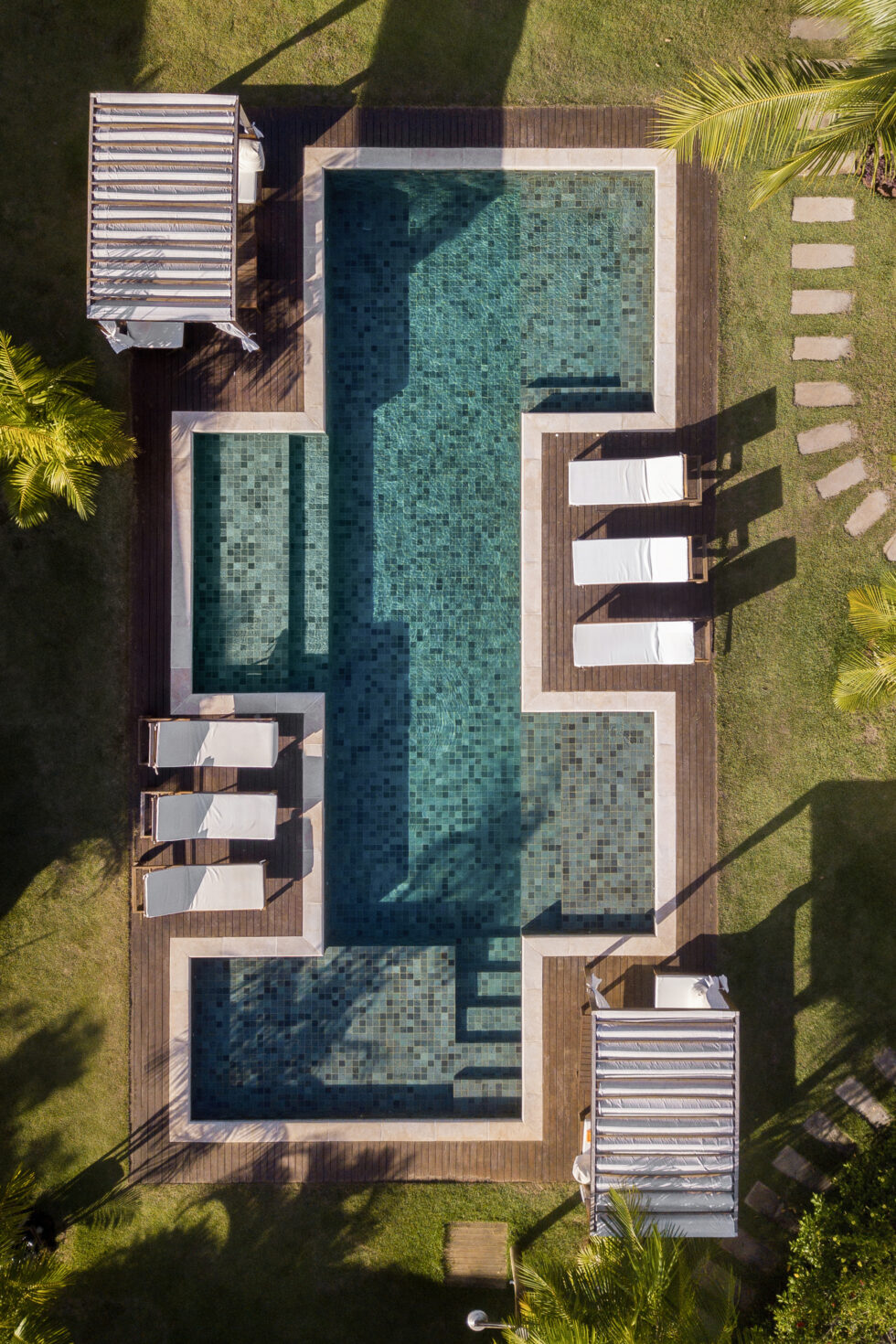 The pool itself has been designed with various internal heights to offer a complete relaxation experience, surrounded by wooden areas with white shades that allow guests to fully enjoy the Brazilian climate.