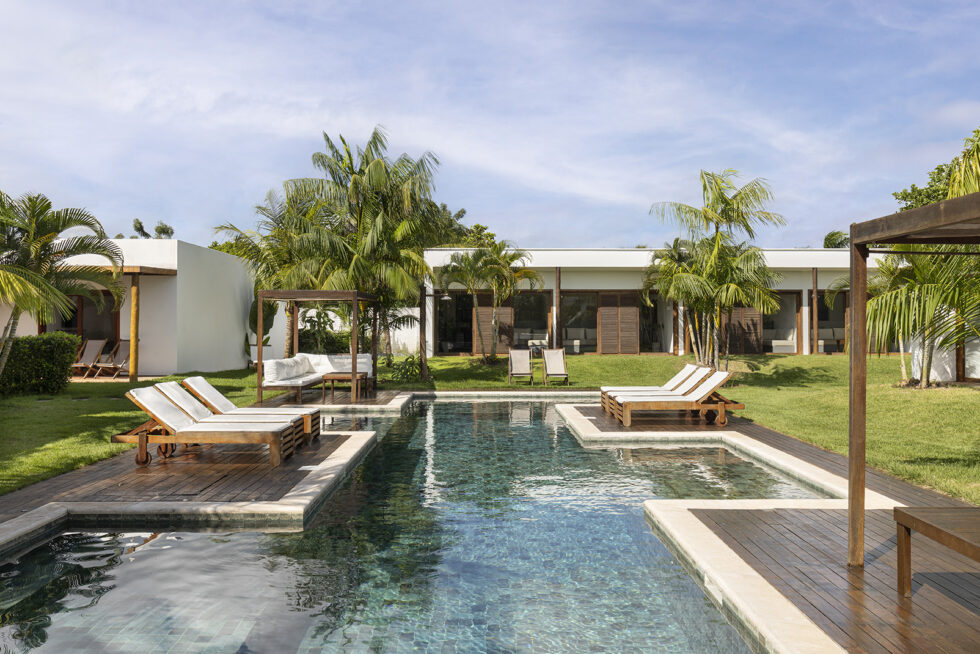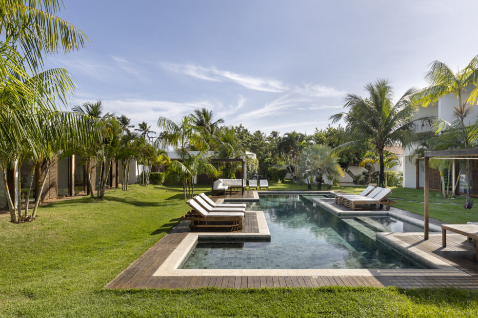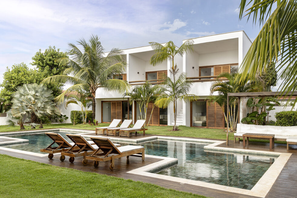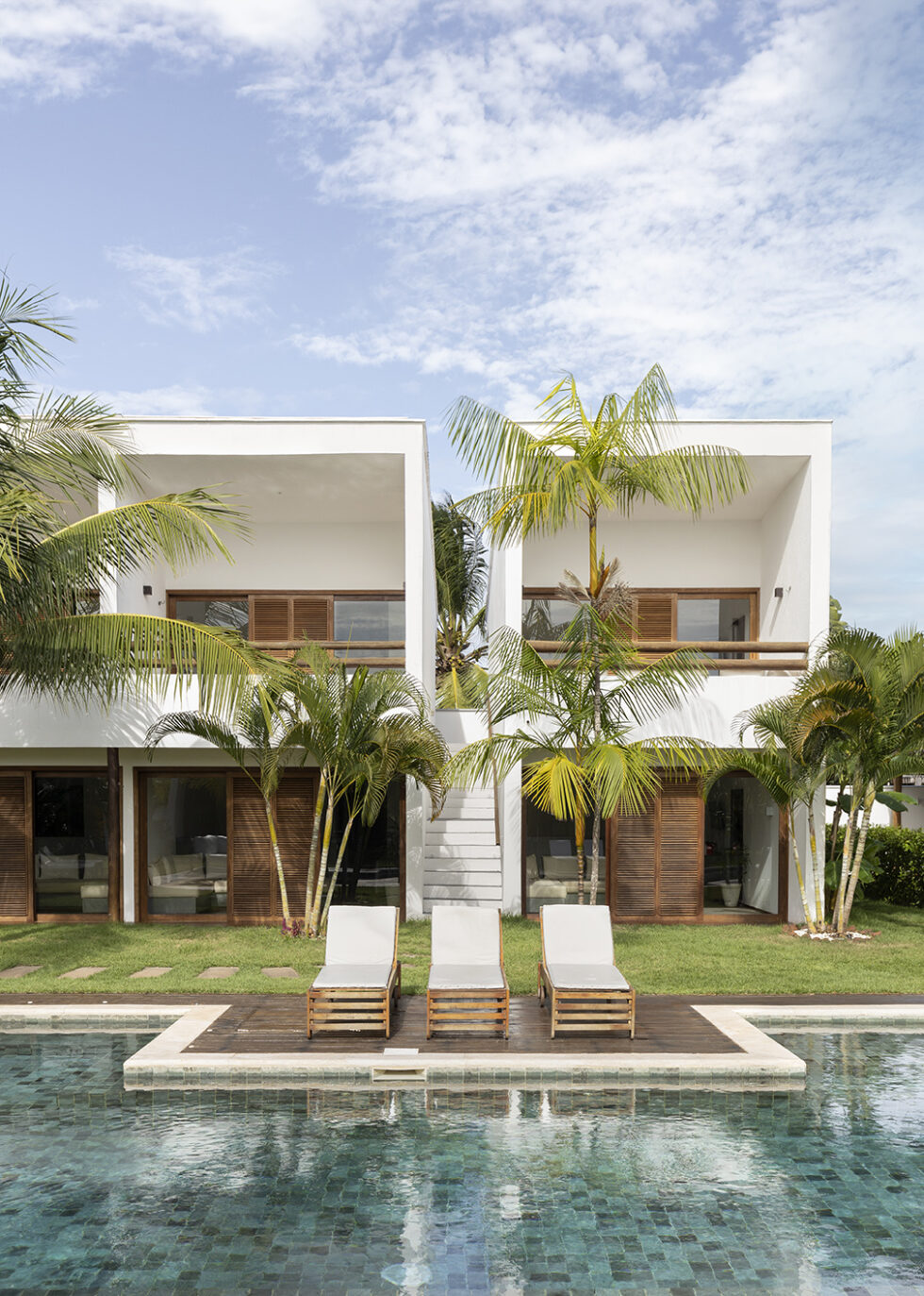 Lush tropical vegetation embraces the outdoor environment, characterized by clean and essential lines, while the buildings gracefully nestle around the pool, creating a welcoming and inviting atmosphere.
