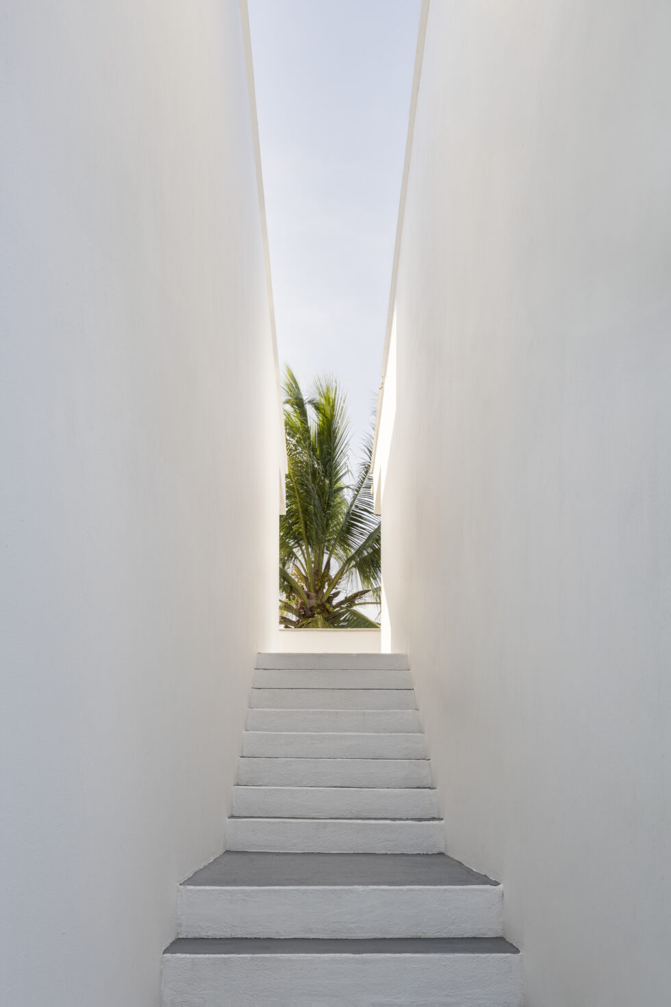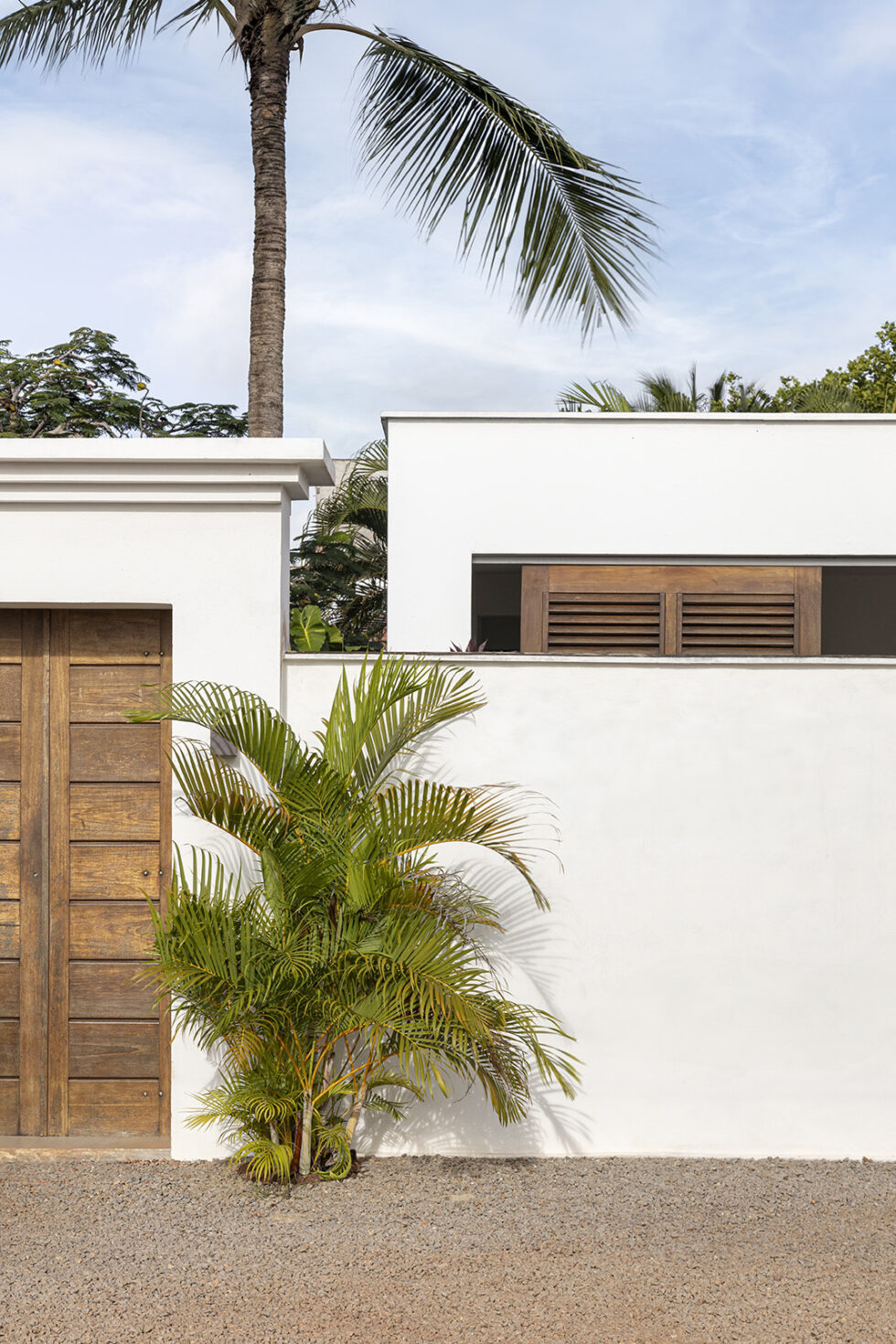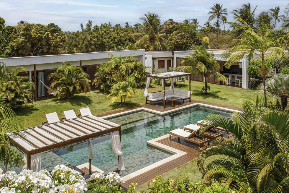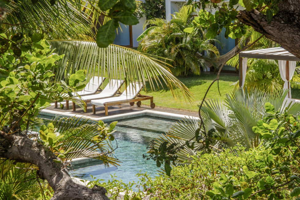 Lush tropical vegetation embraces the outdoor environment, characterized by clean and essential lines, while the buildings gracefully nestle around the pool, creating a welcoming and inviting atmosphere.